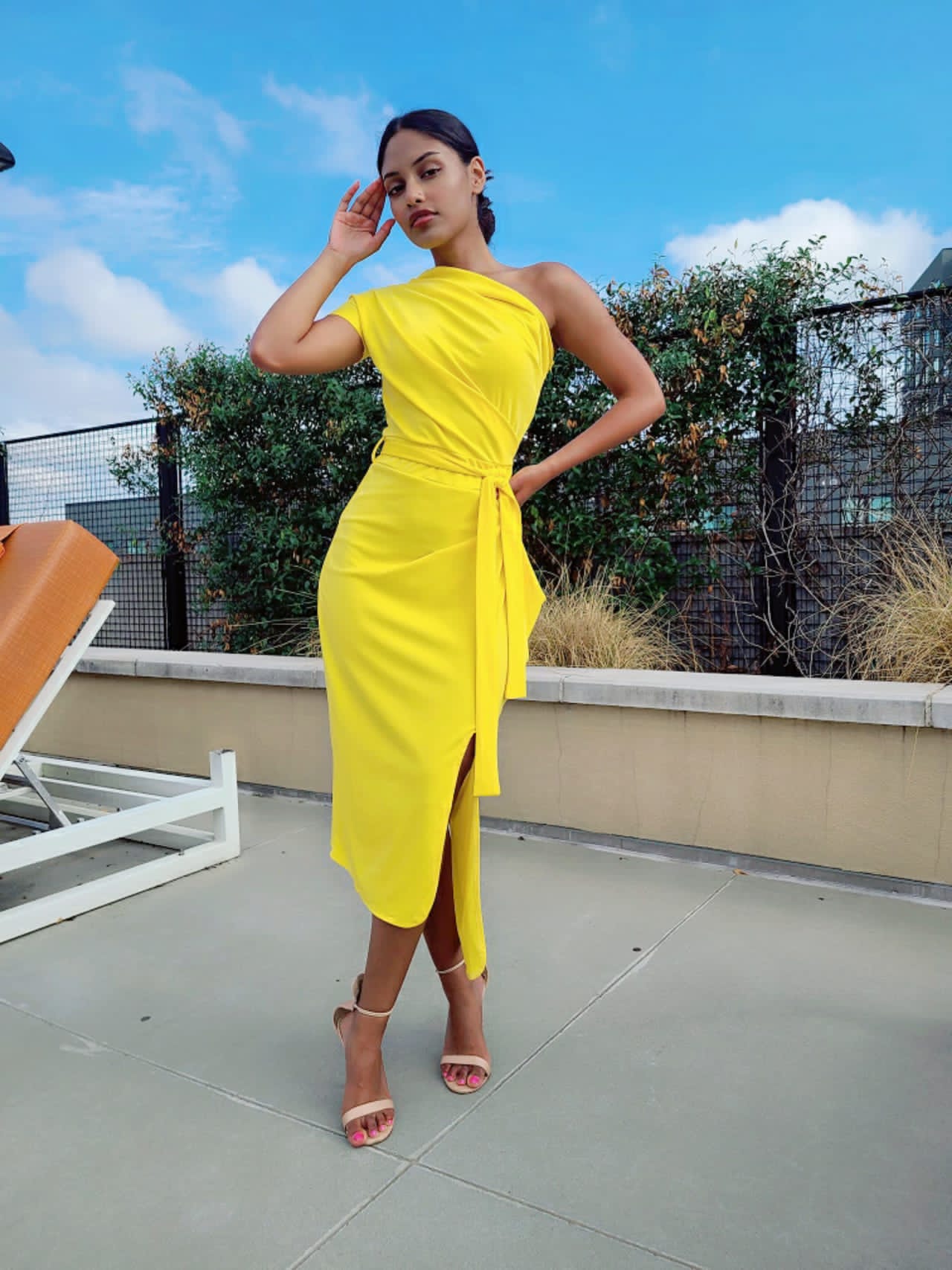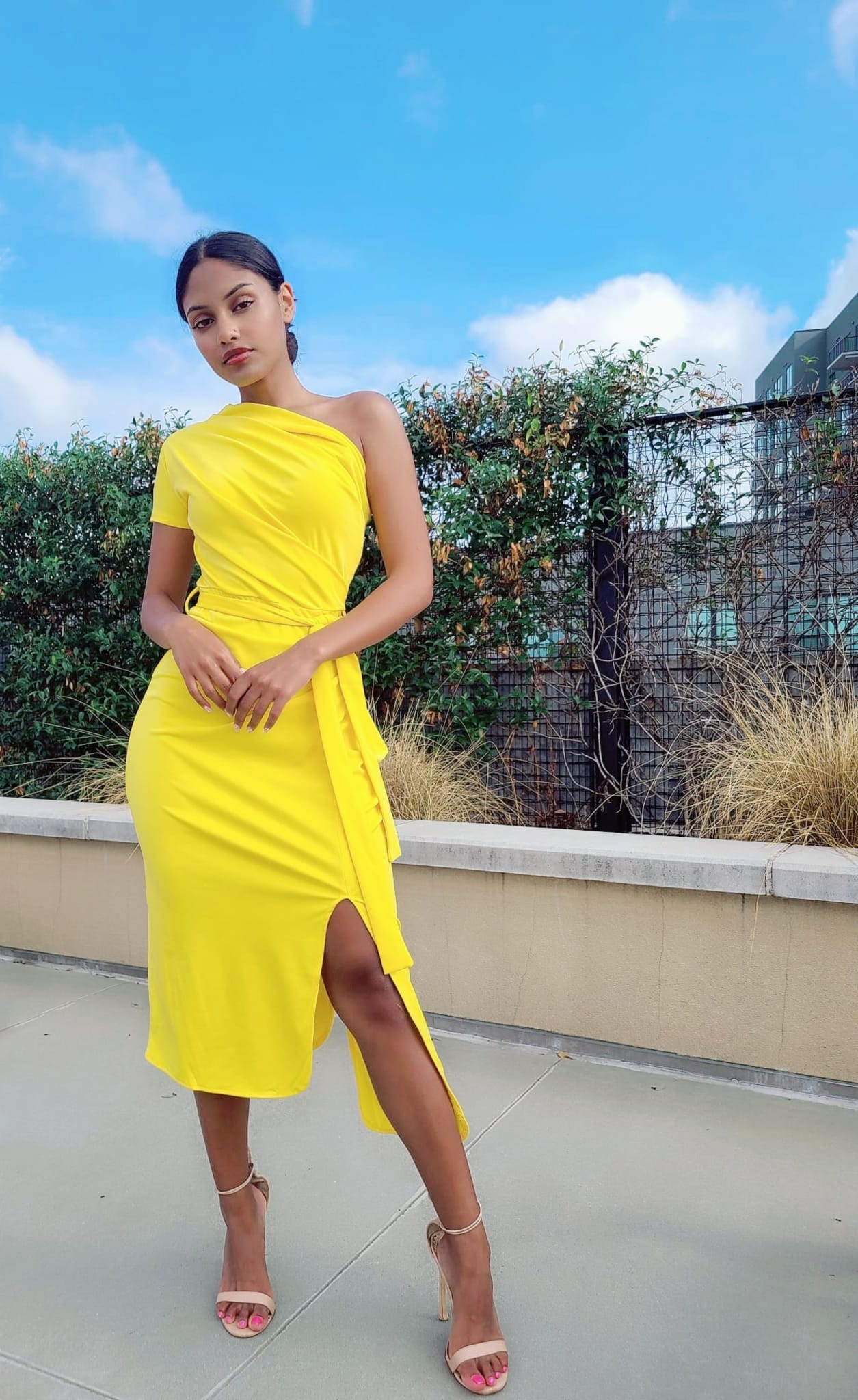| One Shoulder Ruched Slit Dress (Yellow) *Runs small -suggest go up 1 size* |